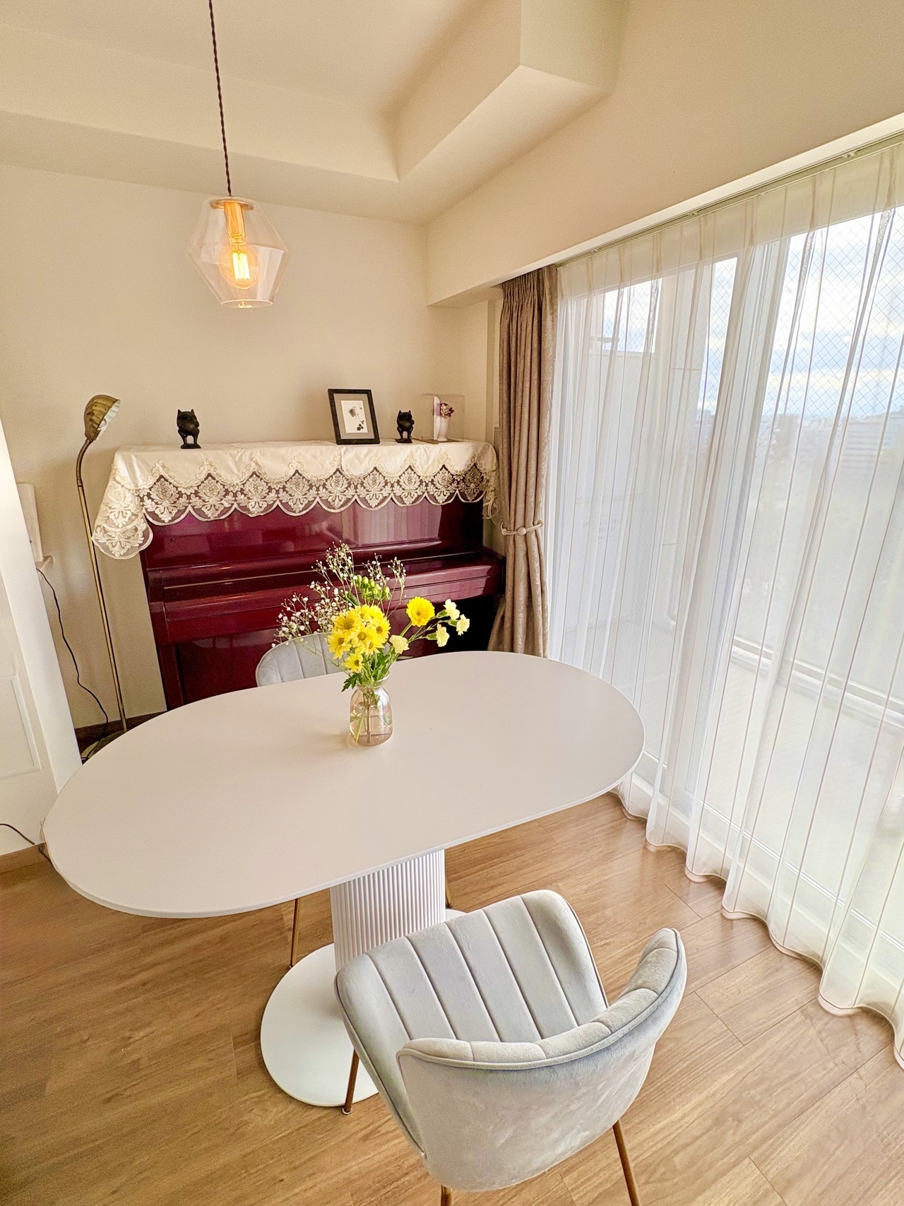 すっきりとしたフォルムのモダンなテーブルを組み合わせ、上品さと軽やかさを併せ持つインテリアに。